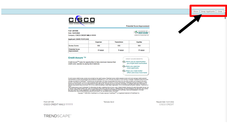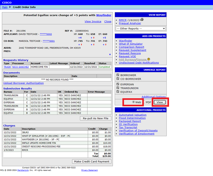 To swap borrower positions on joint files through our web portal, first select Web at the bottom of the Unmerge Report section on the file. Next, select the View button to bring up a new window showing the credit report.